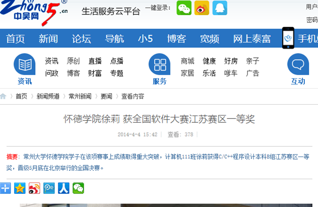 中吴网讯 近日,第五届“蓝桥杯”全国软件和信息技术专业人才大赛(软件类)江苏赛区在常州信息职业技术学院顺利举行。必赢76net线路官网学子在该项赛事上成绩取得重大突破,计算机111班徐莉获得C/C++程序设计本科B组江苏赛区一等奖,晋级5月底在北京举行的全国决赛。计算机111朱羽婷、计算机122张潇、电气121邱学辉、电气122高立健获得江苏赛区三等奖,电气121李威等9名同学获得江苏赛区优胜奖。