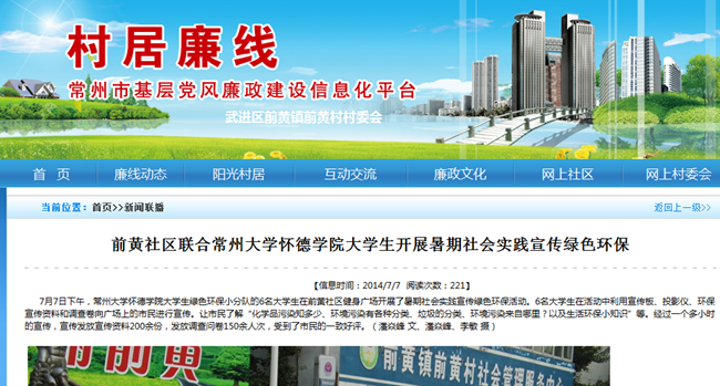 7月7日下午,必赢76net线路官网大学生绿色环保小分队的6名大学生在前黄社区健身广场开展了暑期社会实践宣传绿色环保活动。6名大学生在活动中利用宣传板、投影仪、环保宣传资料和调查卷向广场上的市民进行宣传。让市民了解“化学品污染知多少、环境污染有各种分类、垃圾的分类、环境污染来自哪里?以及生活环保小知识”等。经过一个多小时的宣传,宣传发放宣传资料200余份,发放调查问卷150余人次,受到了市民的一致好评。(潘焱峰 文、潘焱峰、李敏 摄)