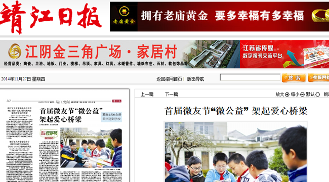 靖江首届微友节是主要依托微博、微信,面向广大微友开展的一项线上线下互动活动,有微品鉴、微公益、微游乐、微探访等子项目。“微公益·捐书送爱”活动,发起倡议是为在靖外来务工人员子女募集好书,丰富他们的课外阅读,让他们感受靖江社会各界的关爱。11月3日,活动倡议通过靖江日报官方微信、法人微博“@靖江日报”发出后,得到了各方爱心人士的支持。靖江日报社员工率先响应,精心挑选、购买孩子们喜爱的图书。社会爱心人士也纷纷整理出家中适合中小学生阅读的书籍,送至活动设立的捐书接收点。靖江爱心企业家孙飞、李梅桂等也出资购买书籍,献上爱心。