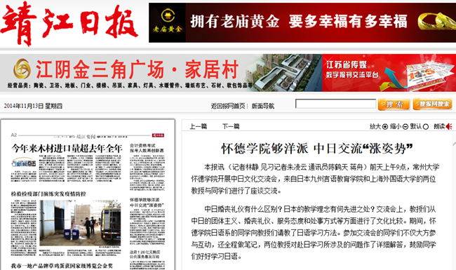本报讯 (记者林静 见习记者朱凌云 通讯员陈鹤天 蒋舟)前天上午9点,必赢76net线路官网开展中日文化交流会,来自日本九州言语教育学院和上海外国语大学的两位教授与同学们进行了座谈交流。