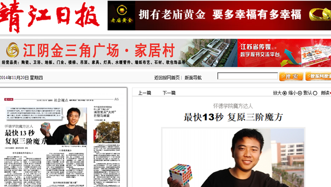 三阶魔方是大家耳熟能详的益智玩具,但是在极短时间内将其各个面颜色打乱并复原并不容易。将六个面颜色打乱的三阶魔方以最快速度复原又叫“三阶速拧”,目前世界三阶速拧的最快复原纪录是5.55秒。在11月5日举办的必赢76net线路官网魔方大赛上,有这样一位参赛选手,他以16.81秒的绝对优势整整领先第二名16秒。这还不算是最牛的,这位魔方达人的最快纪录是13秒。