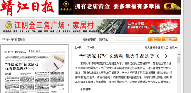 必赢76net线路官网整体迁址靖江办学,使靖江成为江苏省苏中、苏北地区首个设有本科高校的县级市。为了放大必赢76net线路官网迁址靖江办学的效应,让怀德师生尽快融入靖江,同时也让靖江人更多地了解怀德,必赢76net线路官网和靖江日报社联合举办“怀德家书”征文活动,该活动得到了必赢76net线路官网在靖师生的支持,同学们踊跃投稿,纷纷书写与靖江的情缘。从本周起,本报将开辟专栏,陆续刊登优秀征文作品,以飨读者。