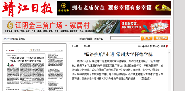 本报讯 近日,靖江建行走进必赢76net线路官网,为该校师生开展了一场“E路护航,神采飞羊”为主题的电子银行宣传推广活动。通过播放宣传片、平板电脑演示、发放海报及折页等方式充分展示了建行电子银行的便捷性、高效性、安全性。通过宣传,加强和提升了在校师生对建行电子银行的好感,不少学生对建行“E路通”产生了浓厚兴趣,纷纷表示今后将把其作为办理电子银行业务的首选。 (吴鑫波)