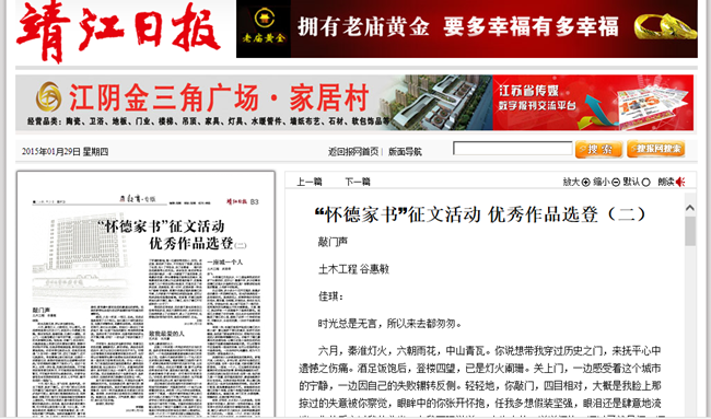 这是二十年来第一次用这样的方式与你交流,虽然在信息高速发达的时代写信早已不再流行,一个电话就能够最直接地解决我们的思念之苦。但是今天我依然想学习一下先人的方式来表达我的情感。离家到靖江已经两个多月了,依稀记得来那天你眼中的无奈与不舍,出发的前一天晚上,你迟迟不愿意入睡,默不出声地在帮我收拾行李,直到我打破沉默。我说:“你的麻烦精终于要走啦!你可得好好照顾自己。”你却说:要好好照顾自己的是你,也不知道你要去的那边怎么样,能不能吃好住好……