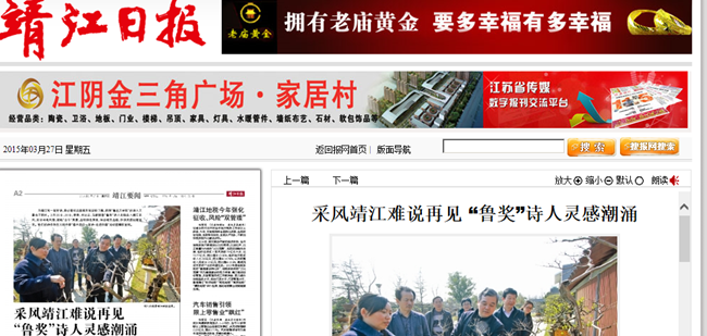 春光里的牧城景区,各式鲜花含苞待放,诗人们漫步江堤,讨论起了靖江的由来,趣味横生;西郊公园盆景园,诗人们跟随向导“结识”一个个山水盆景,盆景或壁立千仞,或山峦连绵,或水穴洞天,或古石青枝,诗人们拿起手机耗费“菲林”无数,赞叹靖江匠人的技艺实在巧夺天工;暗香浮动的百蔚园中,诗人们步入幽香四溢的兰室,俯身闻花香,呷茶说雅事,聊聊靖江的解佩梅,听听园主的养兰经,诗人马新朝雅兴即起,挥毫作成五幅书法作品,最后一首《中国诗人靖江之行》一挥而就后,诗人们纷纷在落款处留名,临走前,他们郑重将书法作品赠予靖江。诗人们的采风之行,俨然美妙得如同一首诗。