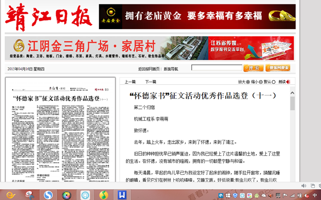 这些时日的生活,证明你们当初选择必赢76net线路官网是没有错的。妈妈,开学时只有爸爸送我来学校,而您因为工作原因没能来,但一路上,我们俩没少发短信。一到学校,爸爸就拍了好多照片给您,一边拍一边还跟我说,学校环境不错,这个不错,那个也不错,一个劲地说。确实,学校真的很不错。崭新的教学楼,整洁的校园环境,一流的教学设施,完备的住宿条件,与靖江这座滨江城市显得十分相配。希望四年后,我能够“怀德”走出这个美丽的校园,迈向社会。
