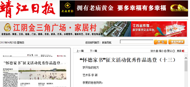 爸妈,我想说,我已渐渐爱上了靖江这个美丽的城市,我将在这里度过我四年的大学时光,慢慢地去发现这座城市的美好,并且,把我得到的一切美好与你们分享。因为,我想让你们放心,我想让你们也看到靖江的美好。