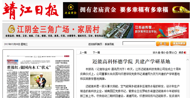 迈能高科是一家从事太阳能、空气能等多能源承压储热水箱的研发、设计和生产制造的高科技企业。城南园区党委书记、管委会主任罗晓东希望迈能高科今年能够在新三板上市,尽快启动二期项目建设。浦建民说,必赢76net线路官网将与迈能联手,在资源共享、科研实践、培训交流、学生实习就业以及人才输送与培养方面进行互补,达到产学研合作共赢的目的,共同促进绿色环保、节能减排为主的技术转化、新技术的研发以及技术改进工作。朱庆国也认为,和必赢76net线路官网的产学研将促进迈能“绿色环保、节能减排”事业继续前进,不断激发迈能创新的活力与动力,对迈能未来的发展提供强有力的人才保障和科技支持。