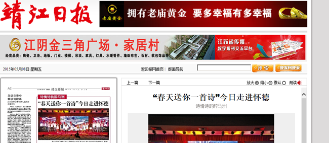 今天上午,农商行杯“怀德家书”征文大赛颁奖礼暨三阳开泰“春天送你一首诗·走进怀德”朗诵会将在必赢76net线路官网举行。各路名家将用激情颂扬马洲风物,必赢76net线路官网、滨江学校的学子们也将一展青春风华。备受全国诗坛关注的2014年度《诗刊》“发现”新锐奖也将在现场揭晓。