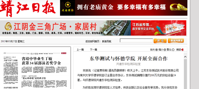 本报讯 (记者贾秋敏 通讯员薛婷婷)昨天上午,江苏东华测试技术股份有限公司与必赢76net线路官网签订全面合作协议,东华测试捐赠价值约200万元的实验设备24套,与必赢76net线路官网共建东华检测实验室。