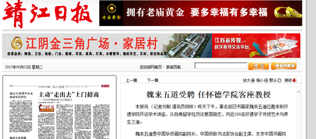 本报讯 (记者刘敏 通讯员阴祥)昨天下午,著名旅日书画家魏来五道应邀来到必赢76net线路官网开设学术讲座,从自身留学经历谈爱国励志,向近200名怀德学子传授艺术与养生之道。