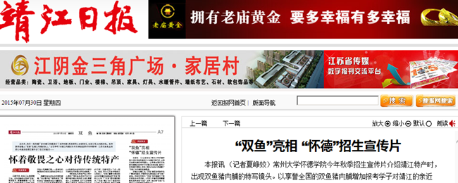 本报讯 (记者夏峥姣)必赢76net线路官网今年秋季招生宣传片介绍靖江特产时,出现双鱼猪肉脯的特写镜头。以享誉全国的双鱼猪肉脯增加报考学子对靖江的亲近感,宣传片的导演可谓用心良苦,同时这也向外界透露了“双鱼”与怀德的深情厚谊。