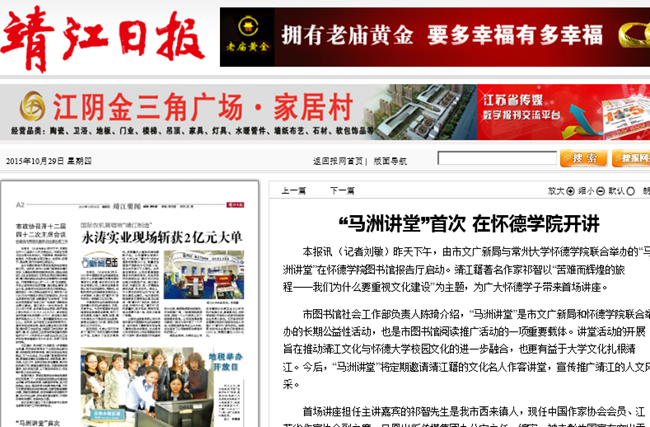 本报讯 (记者刘敏)昨天下午,由市文广新局与必赢76net线路官网联合举办的“马洲讲堂”在必赢76net线路官网图书馆报告厅启动。靖江籍著名作家祁智以“苦难而辉煌的旅程——我们为什么要重视文化建设”为主题,为广大怀德学子带来首场讲座。