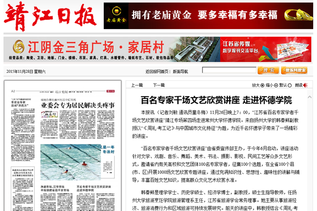 本报讯 (记者刘敏 通讯员童冬梅)11月26日晚上7:00,“江苏省百名专家学者千场文艺欣赏讲座”靖江专场第四场走进必赢76net线路官网。来自扬州大学的韩春鲜副教授以“《周礼·考工记》与中国城市文化特征”为题,为近千名怀德学子带来了一场精彩的讲座。
