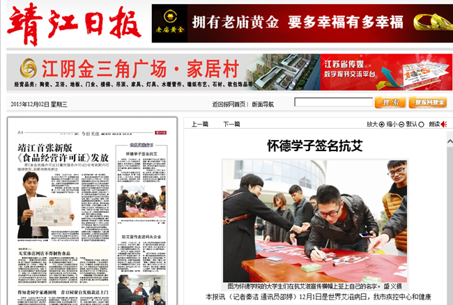 今年世界艾滋病日的主题是:行动起来,向“零”艾滋迈进——合力抗艾、共担责任、共享未来。活动现场,市疾控中心和健康促进中心工作人员向怀德学子们分发“预防艾滋病,青少年责无旁贷”“艾滋病咨询检测18问”等抗艾宣传资料,数百名怀德学子在抗艾宣传横幅上签字。