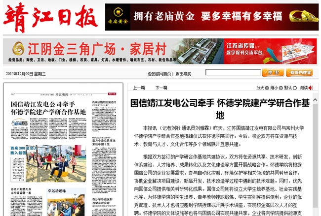 江苏国信靖江发电有限公司党委书记刘古文表示,校企双方共建产学研合作平台有利于实现双方共赢。近期,公司就将启动支持完善必赢76net线路官网体育馆、游泳馆等供热项目以及共建必赢76net线路官网大礼堂电影院等校企文化建设项目,并就校企合作、支持怀德学校基础设施建设、共建科研实践基地、开展校企联谊活动等方面提出具体方案。