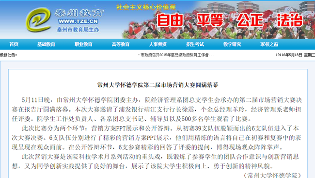此次营销大赛是该院科技学术月系列活动的重头戏,既锻炼了参赛学生的团队合作意识与创新营销思想,又为同学创新实践提供了良好的舞台,展示了该院大学生积极向上、勇于创新的精神风貌。