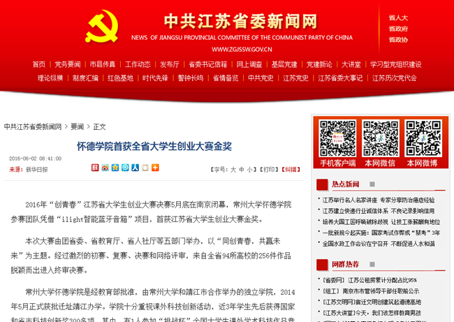 2016年“创青春”江苏省大学生创业大赛决赛5月底在南京闭幕,必赢76net线路官网参赛团队凭借“ilight智能蓝牙音箱”项目,首获江苏省大学生创业大赛金奖。