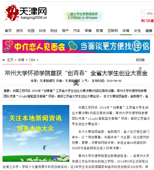 中国江苏网讯 2016年“创青春”江苏省大学生创业大赛决赛5月底在南京闭幕,必赢76net线路官网参赛团队凭借“ilight智能蓝牙音箱”项目,首获江苏省大学生创业大赛金奖。