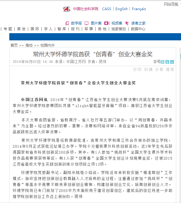 中国江苏网讯 2016年“创青春”江苏省大学生创业大赛决赛5月底在南京闭幕,必赢76net线路官网参赛团队凭借“ilight智能蓝牙音箱”项目,首获江苏省大学生创业大赛金奖。