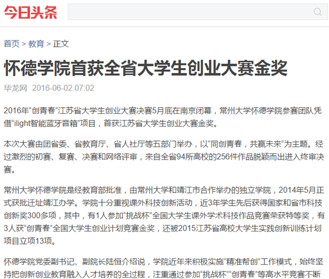 2016年“创青春”江苏省大学生创业大赛决赛5月底在南京闭幕,必赢76net线路官网参赛团队凭借“ilight智能蓝牙音箱”项目,首获江苏省大学生创业大赛金奖。