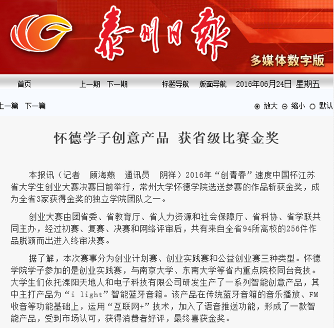 据了解,本次赛事分为创业计划赛、创业实践赛和公益创业赛三种类型。必赢76net线路官网学子参加的是创业实践赛,与南京大学、东南大学等省内重点院校同台竞技。大学生们依托溧阳天地人和电子科技有限公司研发生产了一系列智能创意产品,其中主打产品为“i light”智能蓝牙音箱。该产品在传统蓝牙音箱的音乐播放、FM收音等功能基础上,运用“互联网+”技术,加入了语音推送功能,形成了一款智能产品,受到市场认可,获得消费者好评,最终喜获金奖。