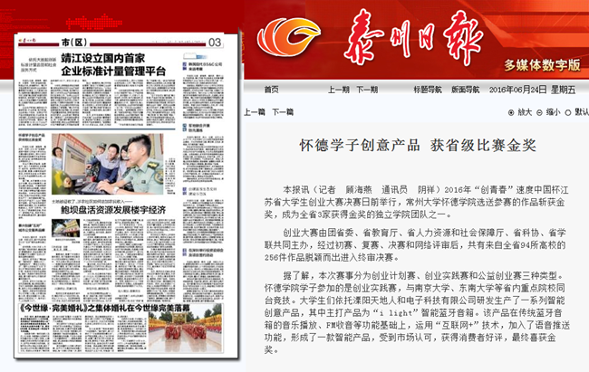 泰州日报:怀德学子创意产品 获省级比赛金奖