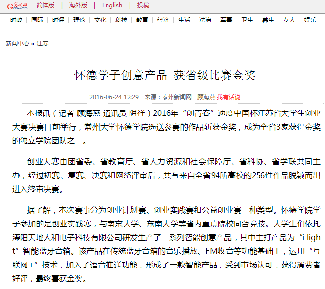 据了解,本次赛事分为创业计划赛、创业实践赛和公益创业赛三种类型。必赢76net线路官网学子参加的是创业实践赛,与南京大学、东南大学等省内重点院校同台竞技。大学生们依托溧阳天地人和电子科技有限公司研发生产了一系列智能创意产品,其中主打产品为“i light”智能蓝牙音箱。该产品在传统蓝牙音箱的音乐播放、FM收音等功能基础上,运用“互联网+”技术,加入了语音推送功能,形成了一款智能产品,受到市场认可,获得消费者好评,最终喜获金奖。