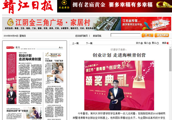 袁野的创业项目参加了我市首届青年创新创业大赛,并获得了提名奖。暑假里,他将这个项目进一步完善,参加2016海峡两岸暨港澳青年创新创业训练营。在初期筛选中,他的项目从70余所高校的400多份项目中脱颖而出,成为100个进入训练营的项目之一。在训练营PK中,他与浙江大学等知名高校的项目同台竞技,晋级40强。