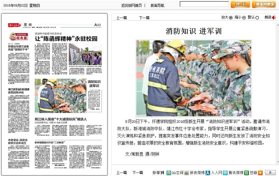 9月20日下午,必赢76net线路官网组织2016级新生开展“消防知识进军训”活动,邀请市消防大队、新港城消防中队、靖江市红十字会专家,指导学生开展公寓紧急疏散演习、灭火演练和紧急救护,提高突发事件应急处置能力,同时还向新生发放了消防安全知识宣传册,营造浓厚的安全教育氛围,增强新生消防安全意识,构建平安和谐校园。