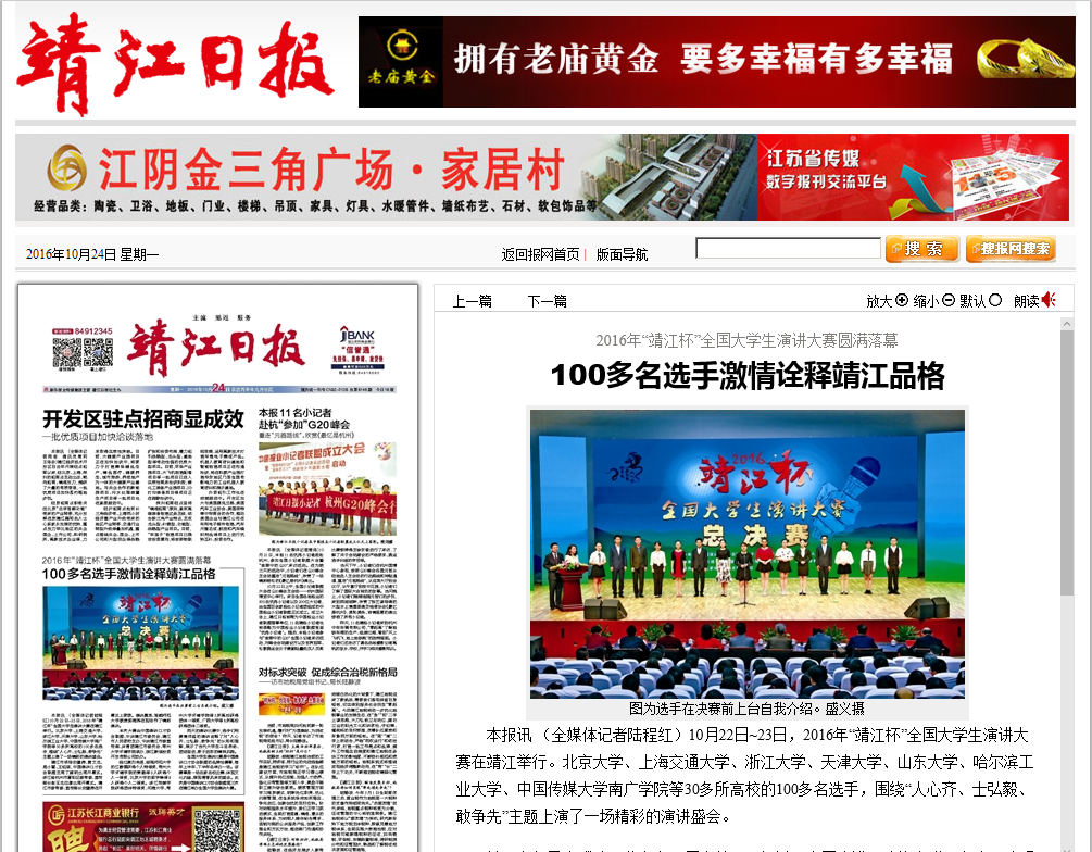 本报讯 (全媒体记者陆程红)10月22日~23日,2016年“靖江杯”全国大学生演讲大赛在靖江举行。北京大学、上海交通大学、浙江大学、天津大学、山东大学、哈尔滨工业大学、中国传媒大学南广学院等30多所高校的100多名选手,围绕“人心齐、士弘毅、敢争先”主题上演了一场精彩的演讲盛会。