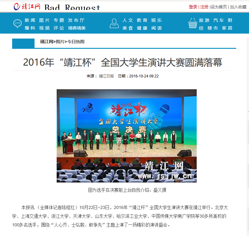 本报讯 (全媒体记者陆程红)10月22日~23日,2016年“靖江杯”全国大学生演讲大赛在靖江举行。北京大学、上海交通大学、浙江大学、天津大学、山东大学、哈尔滨工业大学、中国传媒大学南广学院等30多所高校的100多名选手,围绕“人心齐、士弘毅、敢争先”主题上演了一场精彩的演讲盛会。