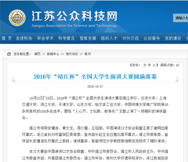 10月22日~23日,2016年“靖江杯”全国大学生演讲大赛在靖江举行。北京大学、上海交通大学、浙江大学、天津大学、山东大学、哈尔滨工业大学、中国传媒大学南广学院等30多所高校的100多名选手,围绕“人心齐、士弘毅、敢争先”主题上演了一场精彩的演讲盛会。