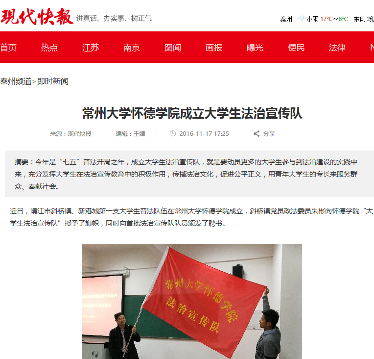 近日,靖江市斜桥镇、新港城第一支大学生普法队伍在必赢76net线路官网成立,斜桥镇党员政法委员朱彬向必赢76net线路官网“大学生法治宣传队”授予了旗帜,同时向首批法治宣传队队员颁发了聘书。