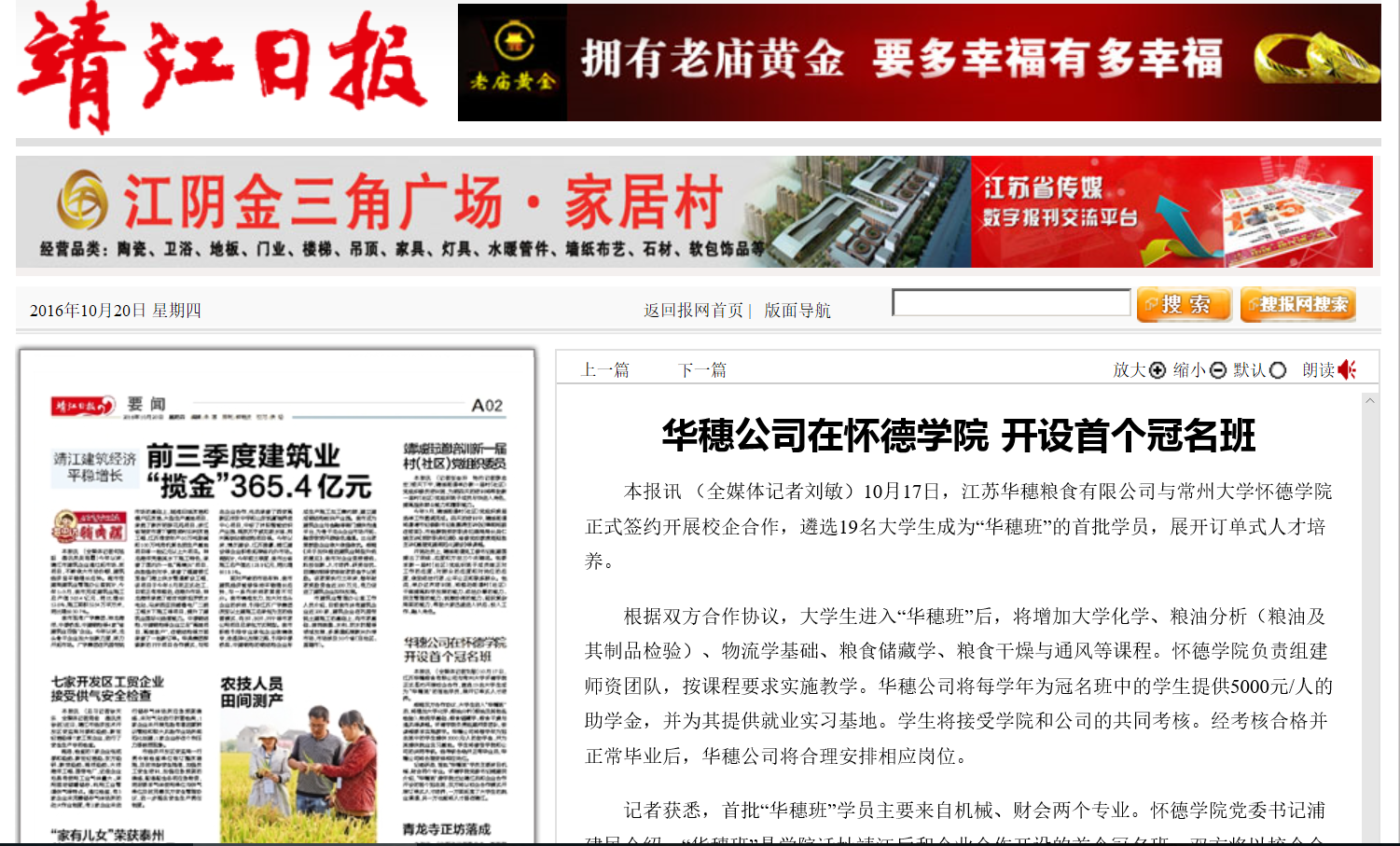 本报讯 (全媒体记者刘敏)10月17日,江苏华穗粮食有限公司与必赢76net线路官网正式签约开展校企合作,遴选19名大学生成为“华穗班”的首批学员,展开订单式人才培养。