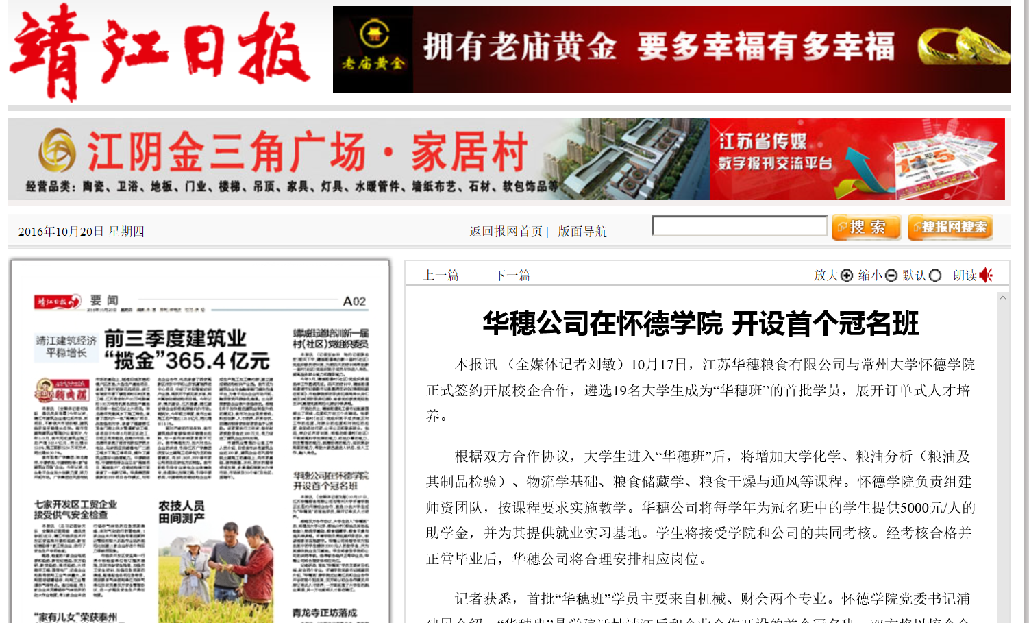 靖江日报:华穗公司在必赢76net线路官网 开设首个冠名班