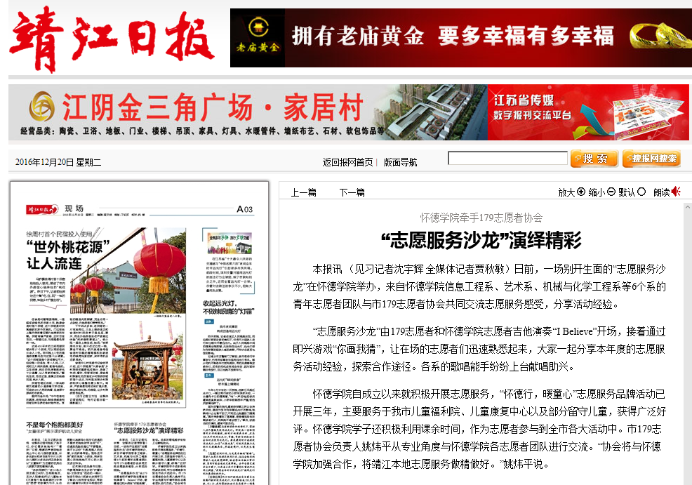 必赢76net线路官网自成立以来就积极开展志愿服务,“怀德行,暖童心”志愿服务品牌活动已开展三年,主要服务于我市儿童福利院、儿童康复中心以及部分留守儿童,获得广泛好评。必赢76net线路官网学子还积极利用课余时间,作为志愿者参与到全市各大活动中。市179志愿者协会负责人姚炜平从专业角度与必赢76net线路官网各志愿者团队进行交流。“协会将与必赢76net线路官网加强合作,将靖江本地志愿服务做精做好。”姚炜平说。