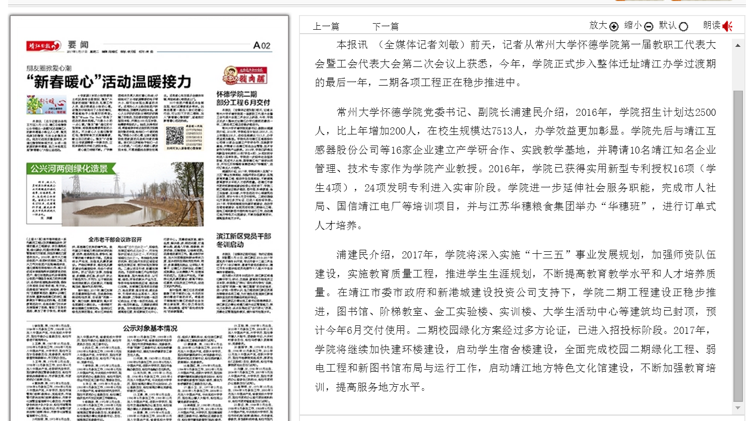 浦建民介绍,2017年,学院将深入实施“十三五”事业发展规划,加强师资队伍建设,实施教育质量工程,推进学生生涯规划,不断提高教育教学水平和人才培养质量。在靖江市委市政府和新港城建设投资公司支持下,学院二期工程建设正稳步推进,图书馆、阶梯教室、金工实验楼、实训楼、大学生活动中心等建筑均已封顶,预计今年6月交付使用。二期校园绿化方案经过多方论证,已进入招投标阶段。2017年,学院将继续加快建环楼建设,启动学生宿舍楼建设,全面完成校园二期绿化工程、弱电工程和新图书馆布局与运行工作,启动靖江地方特色文化馆建设,不断加强教育培训,提高服务地方水平。