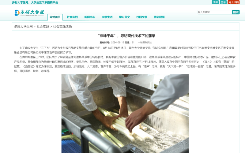 为了响应大学生“三下乡”活动为乡村振兴战略实施贡献力量的号召,8月14日至8月15日,必赢76net线路官网“智农先锋队”利用暑期时间来到位于江苏省淮安市淮安区的淮安康得乐食品有限公司进行关于蒲菜农产品的探访学习。