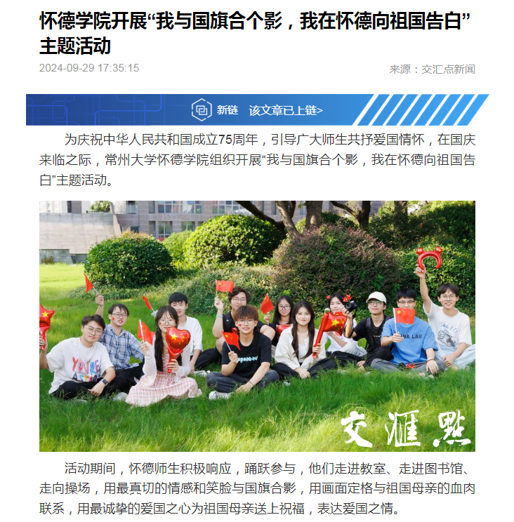 为庆祝中华人民共和国成立75周年,引导广大师生共抒爱国情怀,在国庆来临之际,必赢76net线路官网组织开展“我与国旗合个影,我在怀德向祖国告白”主题活动。