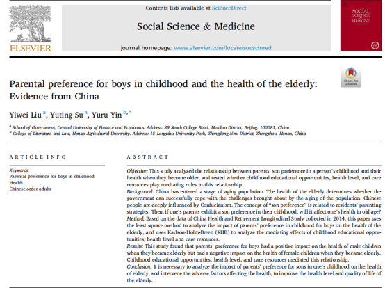 Recently, the academic paper “Parental preference for boys in childhood and the health of the elderly: Evidence from China” by Dr. LIU Yiwei from the School of Government and Management was officially published in Social Science & Medicine (five-year IF=5.299, JCR division: Q1) 2022 Volume 302 (https://doi.org/10.1016/j.socscimed.2022.114986). Social Science & Medicine is an internationally renowned journal in the field of social sciences, and it is also a AAA journal of our school.