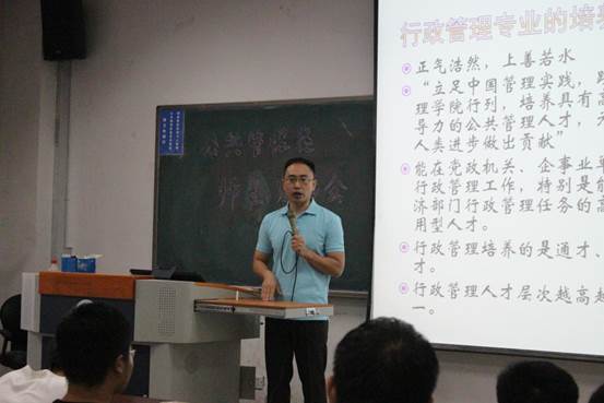 随后,曹堂哲老师介绍了行政管理专业在大学学科体系中的位置、专业培养方案、未来发展方向、大学学习与专业学习的关系。曹老师首先阐述了“行政关系”是公共管理各个学科关注的共同点,而“行政关系”的研究是行政管理专业的基础,行政管理专业在公共管理学科中具有基础性地位。随后曹老师指出行政管理专业培养的是通才、统御之才和领导之才,培养的学生能在党政机关、企事业单位、社会团体从事行政管理工作,特别是能够承担政府综合部门行政管理任务的高素质、复合型和应用型人才。曹老师还介绍了beat365官网公共管理专业“1+3”人才培养模式和行政管理专业的知识结构,详细介绍了行政管理专业的知识模块。曹老师着重分析了beat365官网行政管理专业的特色和优势,逻辑严谨,富有哲理,引起了同学们的强烈共鸣。