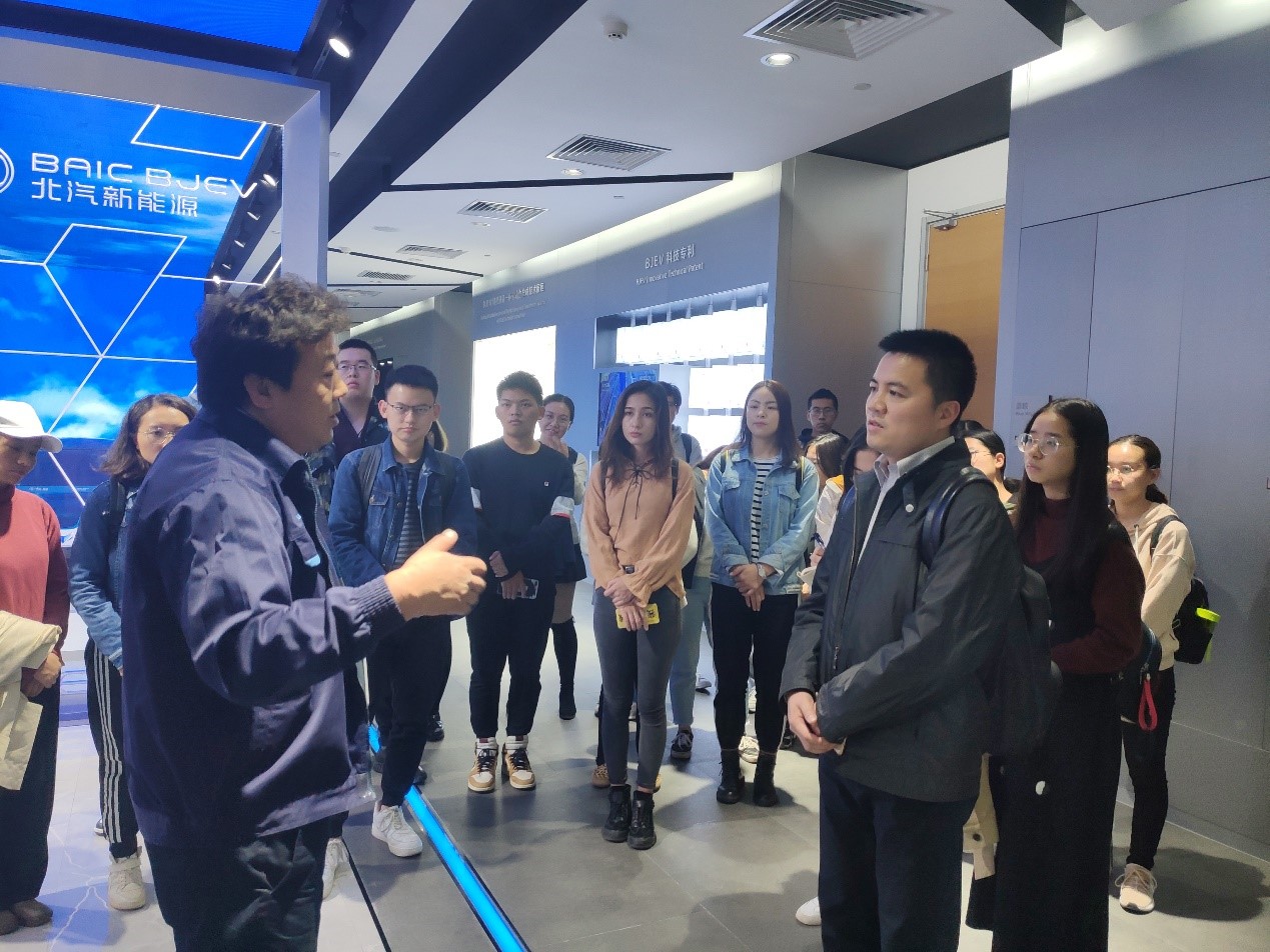 实践教学的第一站来到北汽新能源创新科技研发中心。在科研中心的大厅里,大家首先参观了北汽新能源近年来取得的创新技术成果。北汽新能源自2009年成立至今,紧承国家发展战略要求,在新能源汽车的研发生产方面取得了丰硕成果。目前,北汽新能源纯电动汽车在全国保有量超过了40万辆,初步搭建起首家由整体企业主导的充换电生态体系,在充换电模式升级、电池续航里程提升等方面的研发水平都位居世界前列。