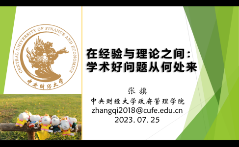 首先,张旗老师提问什么是好的研究问题,并引入了对何谓学术论文、何谓科学研究、何谓研究问题三个问题的辨析,提出了“好问题”的标准——问题立得住、问题有学术价值和现实意义、既有回答不完善、具可证伪性、研究者可驾驭选题。接着,张旗老师提出对于经验困惑的思考和解决,并举例详细讲述了看问题的思维方式:先去关注经验事实,并站在学术前沿,联系相关理论以形成深刻的思考。然后,张旗老师用具体的例子,讲述了理论经验不符的困惑。最后,张旗老师提出了选题重要且有趣的三个标准,即有重大现实意义、有重大理论意义、有吸引人的困惑;并讲述了捕捉经验困惑的方法(捕捉经验事实、联想比较分析、勤于思考发问)和发掘理论困惑的方法(精读专业经典书籍和专业前沿论文、分析比较百家长短)。