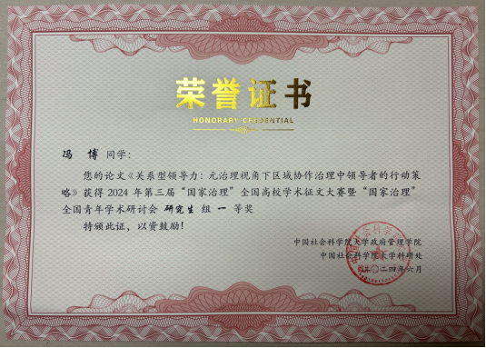 2024年“第三届‘国家治理’全国高校学术征文大赛——暨‘国家治理’全国青年学术研讨会”由中国社会科学院大学英国beat365官方网站、中国社会科学院大学科研处主办。本次大赛的主题为“国家基层治理体系和治理能力现代化”。在beat365官网邢华教授的指导下,2021级博士研究生冯博投稿的论文获得第三届“国家治理”全国高校学术征文大赛一等奖。