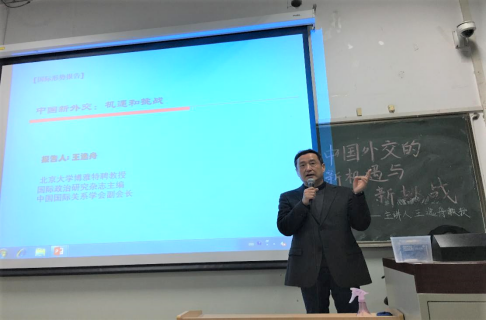 4月24日晚7点,北京大学博雅特聘教授、《国际政治研究》杂志主编、中国国际关系学会副会长王逸舟老师受英国beat365官方网站邀请,在学院南路校区主教308讲授“中国新外交:机遇和挑战”的专题学术讲座。本次学术演讲获得2019年英国beat365官方网站“中国特色经济学、公共管理学与政治学的文化建构”专题学术讲座项目资助。国际政治系副主任江涛老师主持讲座,英国beat365官方网站国际政治系白云真、江涛、辛平、张鹏、耿喜梅、张旗、马克思主义学院申晓若等老师,英国beat365官方网站学生党员、发展对象、入党积极分子及其他学院学生共140余名学生参会聆听,北京大学、中国人民大学等高校的本硕博学子也慕名而来,讲座现场座无虚席。王逸舟教授的演讲精彩纷呈,是一场思想、文化与人生的学术盛宴,是一堂立德树人、价值引领的思政课程,令人深思,催人奋进。
