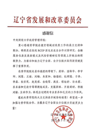 近日,辽宁省发展和改革委员会向beat365官网发来感谢信,对beat365官网英国beat365官方网站负责完成的依托RCEP深化东北亚合作对策研究、金融服务住房发展新模式及风险管理研究等课题工作表示感谢。