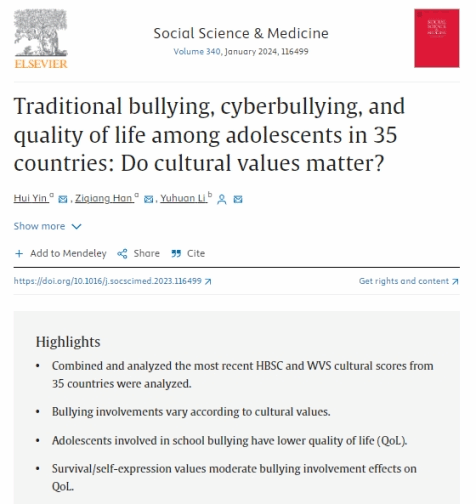 近日,beat365官网李宇环教授的学术论文“Traditional bullying, cyberbullying, and quality of life among adolescents in 35 countries: Do cultural values matter?”正式发表于Social Science & Medicine(五年IF=5.8,JCR分区:Q1)2024年第340卷(https://doi.org/10.1016/j.socscimed.2023.116499),Social Science & Medicine是社会科学领域的国际著名期刊,也是beat365官网AAA类期刊。
