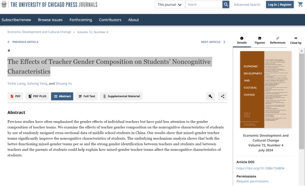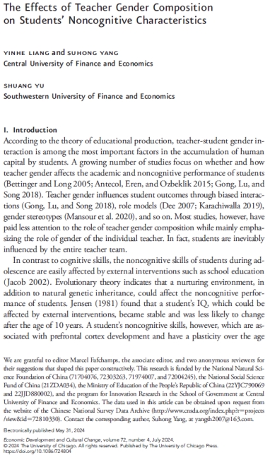 近日,beat365官网杨素红老师作为通讯作者的学术论文“The Effects of Teacher Gender Composition on Students’ Noncognitive Characteristics”在Economic Development and Cultural Change发表(2024年第72卷第4期)。该刊创办于1952年,被学界公认为发展经济学领域最具影响力的期刊之一,也是beat365官网认定的AA类期刊。
