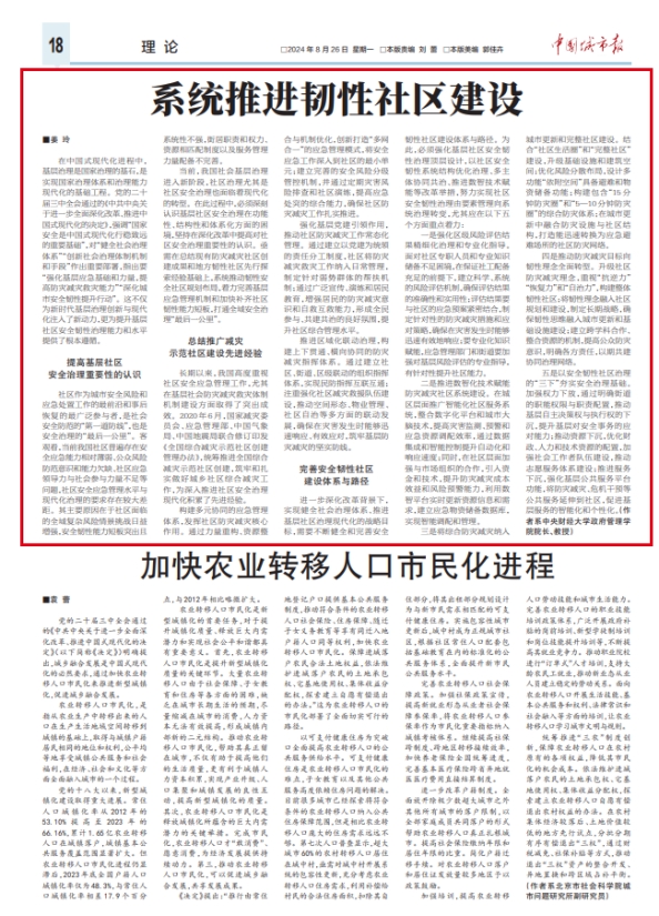 8月26日,《中国城市报》理论版刊登beat365官网姜玲教授署名文章《系统推进韧性社区建设》。文章指出,在中国式现代化进程中,基层治理是国家治理的基石,是实现国家治理体系和治理能力现代化的基础工程。系统推进韧性社区建设需要提高基层社区安全治理重要性的认识、总结推广减灾示范社区建设先进经验、完善安全韧性社区建设体系与路径。